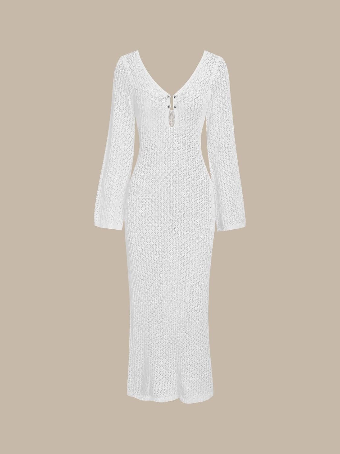 Womens V Neck Bell Sleeve Crochet Maxi Dresses Long Dress Hollow Out Summer Beach Vacation Cover Up