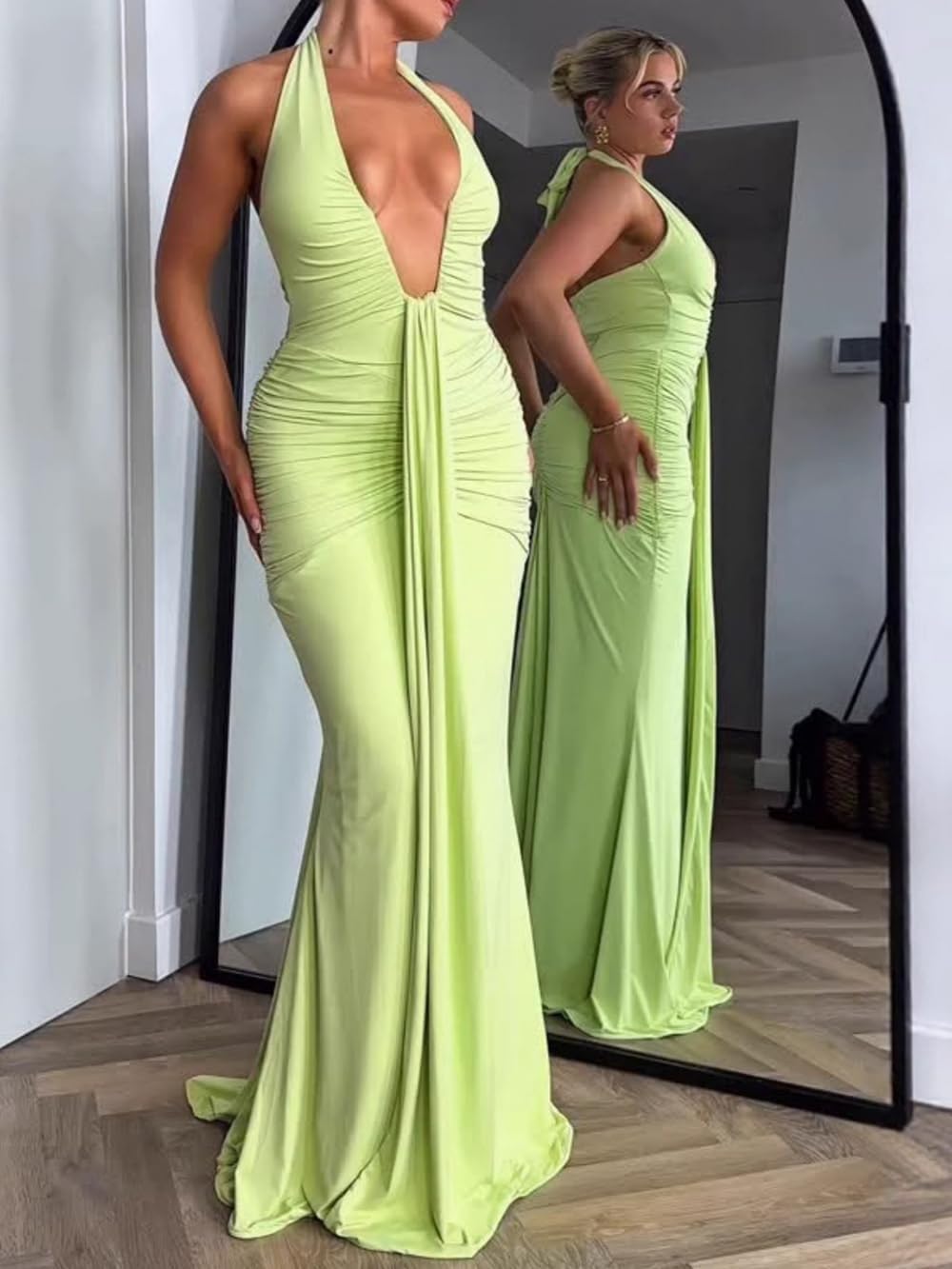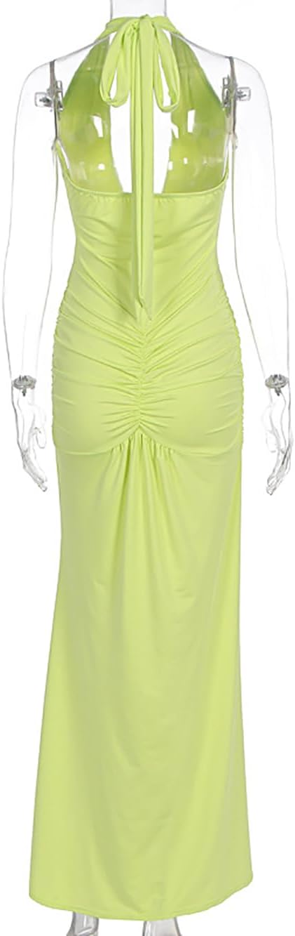 Womens Elegant Halter Deep V Neck Maxi Dress Sleeveless Boycon Backless Ruched Formal Long Dress